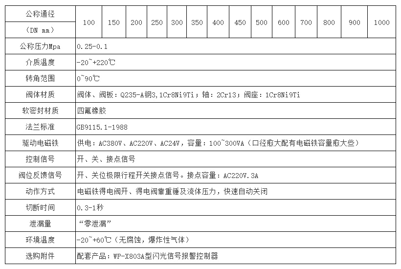 DMF-0.1由密封性能良好的防爆電磁機(jī)構(gòu)、鎖定機(jī)構(gòu)、蝶閥、重錘及重錘臂等部件組成。閥門開啟時(shí),重錘臂處于豎立位置。電源接通,重鍾臂被鎖定機(jī)構(gòu)鎖定,管道正常輸氣。當(dāng)管道內(nèi)介質(zhì)壓力低于規(guī)定值或系統(tǒng)出現(xiàn)異常須立即切斷介質(zhì)時(shí),可通過相應(yīng)的控制回路使電磁機(jī)構(gòu)斷電,解除鎖定。重鍾臂及閥板在重力的作用下,依順時(shí)針方向落下,閥門關(guān)閉。需要恢復(fù)供氣時(shí),將重鍾臂連同重鍾按逆時(shí)針方向轉(zhuǎn)至升至似豎起位置,鎖定機(jī)構(gòu)復(fù)位,此時(shí)行程開關(guān)的接點(diǎn)閉合,電磁機(jī)構(gòu)得電,重鍾臂被鎖定,閥門又呈開啟狀態(tài)。電源系統(tǒng)意外斷電時(shí),切斷閥會(huì)快速切斷。 通過控制電路與其中它的電氣設(shè)備進(jìn)行聯(lián)鎖運(yùn)行,切斷煤氣,以滿足生產(chǎn)系統(tǒng)的安全要求。功耗低。工作能耗一般為20W~40W,發(fā)熱量小,無噪聲,對(duì)于電力系統(tǒng)瞬間斷電(<0.5秒)有較強(qiáng)的抗干擾能力。